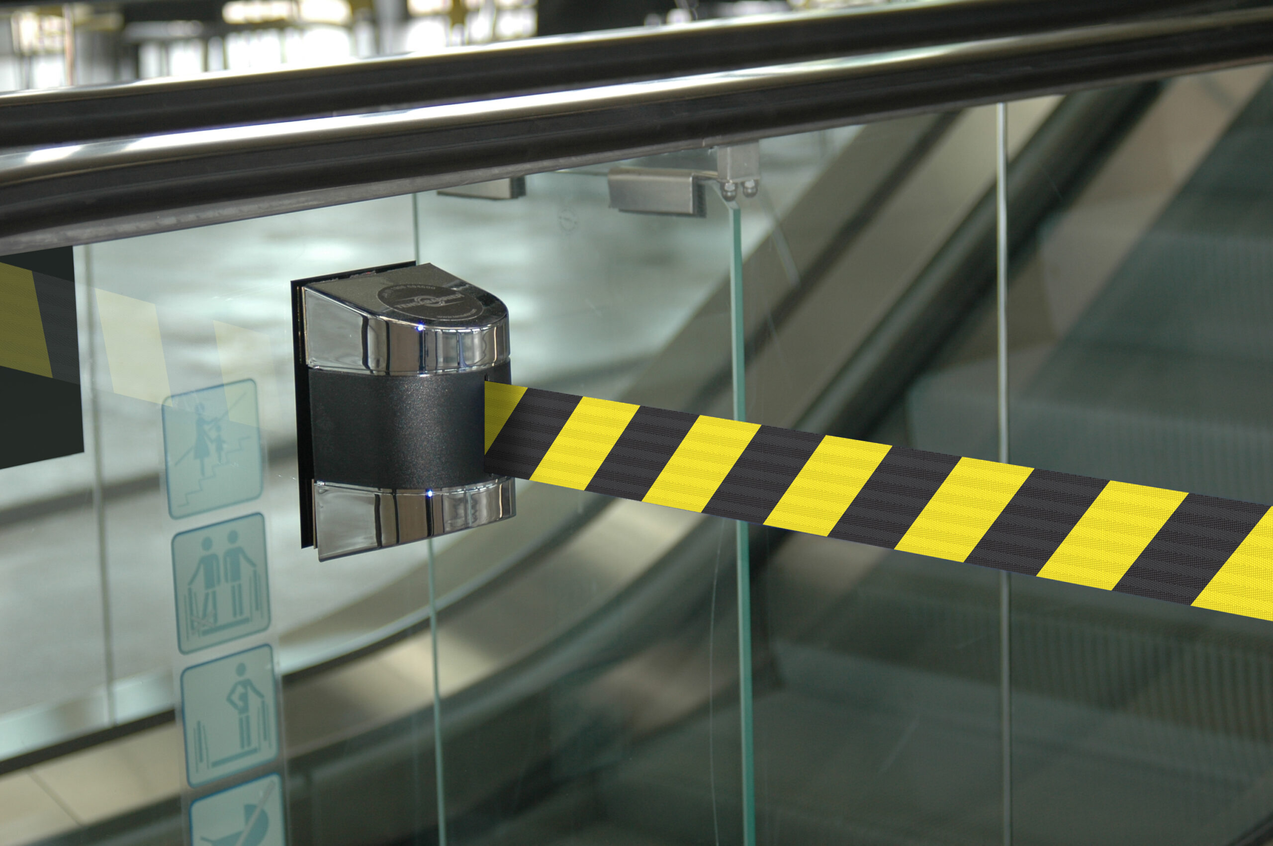 A Tensabarrier® Wall Unit with messaging directly onto the webbing is an easy place to start. This retractable wall mounted barrier is ideal for areas requiring regular maintenance checks and repairs. For example, a wall unit on an escalator to highlight when it is out of order. A combination of universally recognised iconography with clear messaging will help highlight hazards. Messaging on a physical barrier is simple and effective during busy periods.