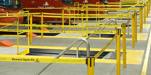 Tensator oferuje elastyczne rozwiązania do zabezpieczenia kanałów zatwierdzone przez brytyjski Główny Urząd ds. BHP, przyczyniające się do poprawy bezpieczeństwa wizualnego w zajezdniach i warsztatach.