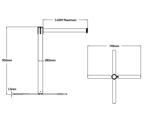 Standard-Gurtbandbreite (50 mm) mit zwei Chevron-Mustern erhältlich. Auf Anfrage sind kundenspezifisch bedruckte Gurtbänder möglich. Standardmäßig ist jede Sicherheitsabsperrung mit 3,65 m Gurtband ausgestattet. Die Farbe des Gurtpfostens ist auf die Auswahl des Gurtbandes abgestimmt.