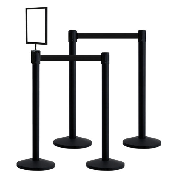 Lot de 4 poteaux enrouleurs à sangle de qualité professionnelle. De plus, le modèle Queueway® est une solution complète et économique qui permette à la fois de guider votre clientèle, délimiter l’accès à une salle interdite mais également de sécuriser une zone. Le set est composé de 4 poteaux de guidage et d’un porte-pancarte au format A3 ou A4. Disponible en finition acier laqué noir et sangle noir, le set de poteaux à sangle rétractable s’adapte à tous les environnements, assurant un flux client organisé.